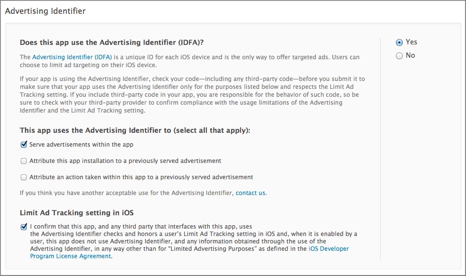 When submitting your application to the App Store you need to update its "Advertising Identifier (IDFA)" settings in order to comply with Apple advertising policy.