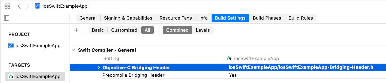4. Make sure the Bridging Header is declared in "Build Settings" with the right path